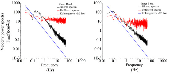Power spectra of unfiltered and filtered velocity time-series at outer and inner bends. is the velocity power spectra of the streamwise velocity , which is a function of frequency (in Hz).