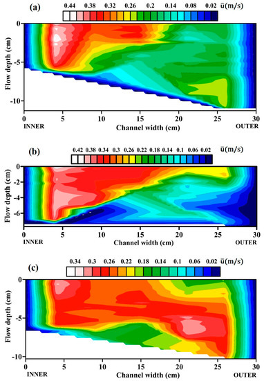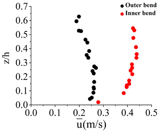 where n is the total sample number. In Figure 3, we observe that the magnitude of inner velocity is more when compared to the outer bend of the channel throughout the flow depth. This result is similar to that found by the authors of the papers [3,12,38] who claimed that the velocity is greater in the inner bend than outer because of velocity redistribution. Rozovskiῐ [1] considered the logarithmic distribution for the streamwise velocity profile expressed as: