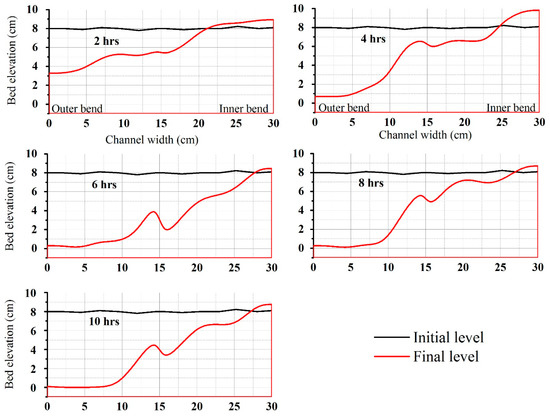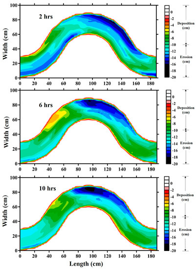 Morphological changes along the second bend of the sinuous channel after 2, 6, and 10 h. This bend was selected because it was unaffected by the entry and exit conditions.