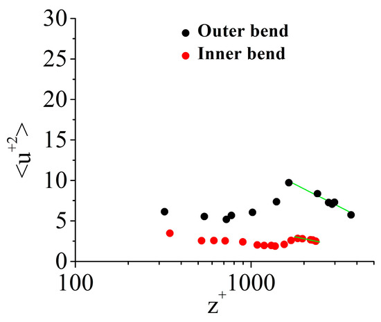 Streamwise velocity variance in turbulent boundary layers for flow at inner and outer bends of the sinuous river channel.