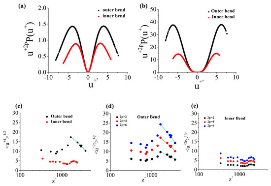 Premultiplied probability density functions (PDF) of normalized velocity fluctuations at with moments (a) and (b) . (c) Moments of order for streamwise velocity as a function of wall-normal distance. Moments of different orders of streamwise velocity fluctuation as a function of wall normal distance for flow subjected to (d) outer bend and (e) inner bend.