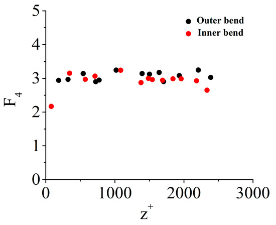 Further investigation was carried to see the flatness or kurtosis in the inner and outer bend of the channel (Figure 9). The flatness factor of streamwise velocity was calculated as: