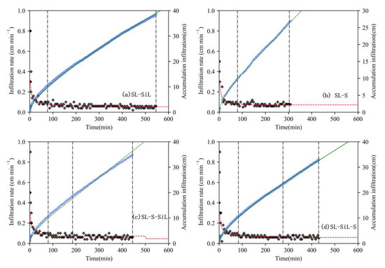3.2. Water Infiltration Rate and Cumulative Infiltration of Different Soil Profiles