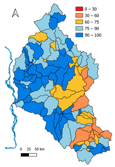 We assigned a score of 100 to a fully connected river network where migratory fish had access to all sub-basins.