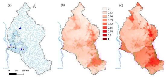 The modelled flow regimes for the various hydropower dam scenarios were compared against modelled unregulated natural flow using the Amended Annual Proportion of Flow Deviation indicator [,], which provides a score. This score increases with the level of alteration and was assigned an Ecosystem Health Score (EHS), which ranges from 0 to 100, with 100 being no deviation from the natural flow regime. We assessed four locations (Figure 1):
