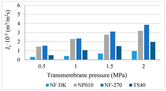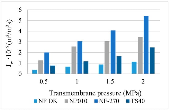 In the first stage of research, four nanofiltration membranes were tested [34]. These wastewaters were subjected to initial purification in the ultrafiltration process. An ultrafiltration membrane of the HZ15 symbol from Osmonics was used for this purpose. The ultrafiltration effect of wastewater treatment was the complete removal of the suspension and turbidity. After the initial purification, to separate multivalent ions, bacteria, and organic impurities from wastewater, the filtrate was directed to a selected nanofiltration membrane. In Figure 3 and Figure 4, the dependence of the volume ultrapure water jet Jw and the filtrate Jv on the transmembrane pressure during the nanofiltration process is shown.