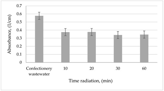 In the case of the absorbance value of confectionery sewage, its decrease in the range of 35%–41% along with the increase of UV radiation time was noted. It can be stated that, after 30 min of radiation, satisfactory results were obtained. Meanwhile, the color of sewage was reduced by 59% after the first 10 min of UV radiation. Lower efficiency of the photooxidation process was found when organic carbon was removed. Its concentration remained almost constant. After 30 min of exposure, only a 6% decrease in the concentration of this component was noted. On the basis of these results, it was found that 30 min of exposure will be sufficient for pre-treatment of wastewater from the confectionery industry.