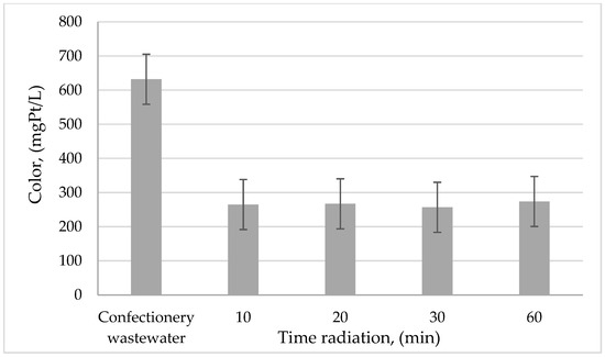 The first stage of the study was to compare the efficiency of confectionery wastewater treatment by photooxidation at different radiation times, that is, 10, 20, 30, and 60 min. The most preferred radiation time is chosen based on the removal of organic compounds and to reduce the color of wastewater. Considering the pH and sewage conductivity, there were no significant changes in value. The photolysis process was intended to reduce the concentration of organic impurities found in confectionery wastewater. The test results obtained are shown in Figure 5, Figure 6 and Figure 7.