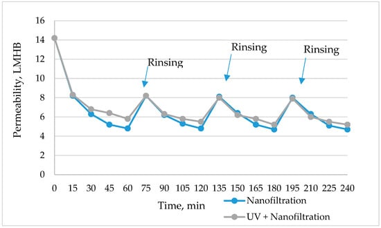 As seen in Figure 10, the permeability of membranes for wastewater decreased significantly compared with the permeability of ultrapure water along the nanofiltration. It was found that the volume stream of treated sewage decreased with the increasing time. A positive effect of membrane washing with ultrapure water was observed. It was observed that the introduction of rinsing over the membrane surface restored the initial volume flow of treated wastewater. In the case of initial photooxidation of confectionery wastewater, nanofiltration efficiency increased by 17%. Similar effects were obtained in studies [35] where UV/H2O2 was used to treat wastewater from an oil refinery prior to the nanofiltration process. The authors noted an increase in the efficiency and lifetime of nanofiltration membranes [35]. The same applies to improving the efficiency of ultrafiltration membranes in other research [13], where UV radiation was found to improve the process efficiency ultrafiltration of municipal wastewater.
