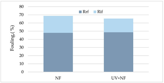 It was found that the combined process supported that the lower organics content after the oxidation pre-treatment could have contributed to improving the performance of the NF process. Similarly, Li et al. reported that the oxidation pre-treatment contributed to improving the performance of the UF process [36].