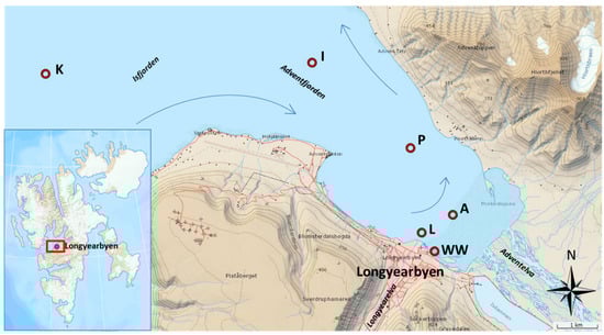 Location of the study in Adventfjorden, Isfjorden. The circles represent sampling points (K = Karlskrona depth, reference point in Isfjorden; I = IsA station, reference point in Adventfjorden; P = wastewater pipe outlet to Adventfjorden, A = Adventelva outlet to Adventfjorden; L = Longyearelva outlet to Adventfjorden; WW= raw wastewater pumping station). The arrows represent dominant water current in Adventfjorden (modified from toposvalbard.no).