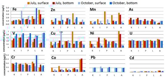 The concentrations of heavy metals in Adventfjorden investigated in this study followed the general order: Fe ≥ Zn ≥ Mn ≥ As ≥ V ≥ U ≥ Cu ≥ Ni ≥ Cr ≥ Pb > Co > Cd, which only to some extent follows the order represented by wastewater presented above. Moreover, in this study, the differences in heavy metals concentrations in the marine water were not as pronounced as in the wastewater. None of the metals in the recipient exceeded concentration of 5 μg/L (Figure 2). In the summer season, Pb was below detection limit (<0.10 μg/L). The concentrations of cobalt, nickel, cadmium and iron in summer season were the highest at the Adventelva outflow (sampling point A). The concentrations of vanadium in October were higher than in July and bottom samples presented higher values than surface water samples. On the contrary, manganese concentrations were on average higher in surface than bottom water samples and were the highest for surface samples in July. A similar relation with the depth was noted for Ni, Co, Fe and Zn. Fe levels also increase near the river outlets (points L and A, see Figure 2), in contrast to As. Arsenic presents higher concentrations in the bottom water samples, which is more pronounced in July.