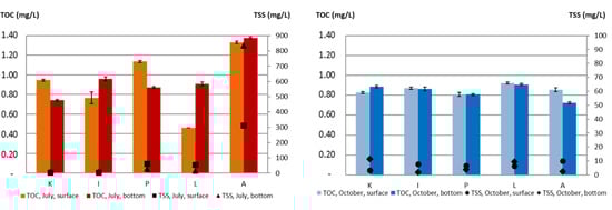 Total organic carbon and suspended solids concentrations in the recipient in July (left) and October (right). The bars refer to TOC values, the black symbols to TSS. Note different scales for TSS. The labels on the x axis refer to the name of the sampling stations (K, I, P, L, A).