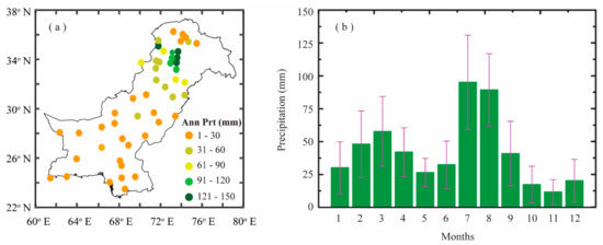 The precipitation (P) variability of the region is shown in Figure 2, indicating the long-term mean precipitation at station scale (Figure 2a), and mean monthly P averaged for the whole stations (Figure 2b) in the study region. From Figure 2a, the annual mean P pattern appeared to be following a distint latitudinal variation from south to northwards. In the upper reach (i.e., northern humid region), the annual mean P ranged from >30 mm to >150 mm. The region was located in the foothills of the Himalayan Mountains, and is the core monsoon region. Moreover, the region also received an adequate amount of seasonal P from the westerlies system. However, the extreme northern parts appeared to show a decrease in annual mean (1.0 to 30mm) due to their geographical location, where only westerlies were the primary source of local scale hydrological cycle [62]. Similarly, the lower reach (i.e., southern parts) were characterized by arid and semi-arid climates with minimal quantity of precipitation (<30 mm). It should be noted that the southern parts of Pakistan are dominated by the coastal and tropical climate and are isolated from the monsoon and westerlies systems [46,59].