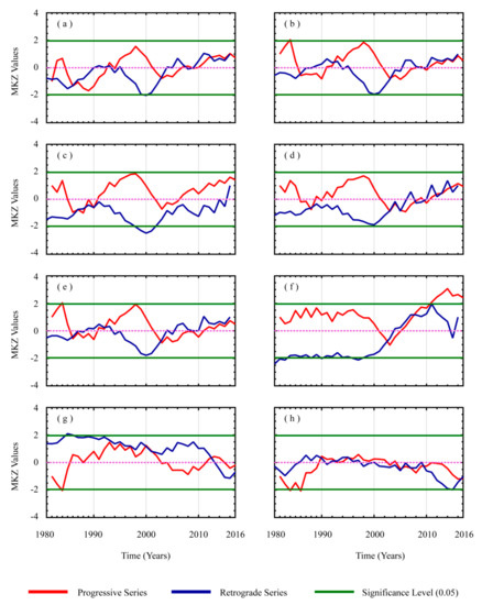 The SqMK test was introduced by [84] to determine the significant mutation points in a time series. The abrupt changes in the temporal trend are estimated by the series of the forward sequential statistic (ut) and backward sequential statistic (u′t). The sequential behaviors of ut fluctuate around the zero, as it is a standardized variable with zero mean and unit standard deviation. Moreover, it has the same nature as that of Z values, starting from the first to last data point. On the other hand, the value of u′t is computed backward, starting from the endpoint to the first point of a time series. The test considers relative values of all terms in a time series (x1,x 2, …, xn). The following steps can express the test.