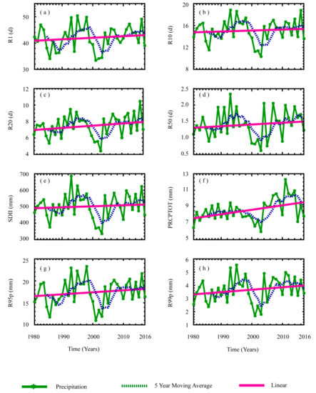 Linear trend in different P indices during the study period: (a) R1 ≥ 1 mm, (b) R10 ≥ 10 mm, (c) R20 ≥ 20 mm, (d) R50 ≥ 50 mm, (e) PRCPTOT, (f) SDII, (g) R95p, and (h) R99p.
