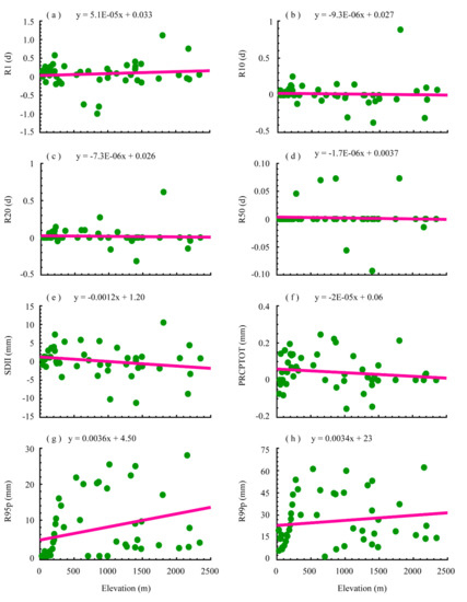 Linear trend in different P indices with respect to elevation used in the study: (a) R1 ≥ 1 mm, (b) R10 ≥ 10 mm, (c) R20 ≥ 20 mm, (d) R50 ≥ 50 mm, (e) PRCPTOT, (f) SDII, (g) R95p, and (h) R99p.