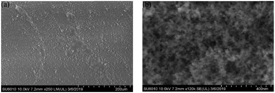 The superaerophilic straight trajectories (SALT) are obtained using spray coating with a silica nanoparticle solution (Glaco, Soft99 Co., Japan, SiO2 of 30-nm primary diameter). After solvent evaporation, the coating is further dried in a vacuum drying chamber at 150 °C for 30 min, and this coating for a trajectory was repeated three times. Based on these procedures, silica particles can adhere to the trajectory surface, forming a superhydrophobic nanostructure with a typical roughness of about 100 nm, as reported by Maleprade et al. []. Other necessary operation steps for surface treatment are as follows: First, the glass surface is ultrasonically cleaned with ethanol solution for 5 min and then is rinsed with deionized water and is dried in the vacuum drying chamber. Second, the designated areas of trajectories are constructed using a mask to achieved different trajectory widths (0.5 mm–5 mm) on the slides. Finally, the superaerophilicity of the trajectories would be tested by ejecting water drops and then spreading bubbles on them. The microscopic morphology of the trajectory surface produced through the above steps is shown in Figure 1. It can be seen from the SEM images that the surface is almost uniformly covered with the SiO2 nanoparticles.