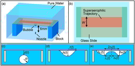 The tank (150 mm × 150 mm × 150 mm) is filled with purified water. The slide sits horizontally on two standard gauge blocks (30 mm × 9 mm × 70 mm, vertically) to located itself 6 mm above the nozzle outlet, as shown in Figure 2a. The bubbles are released from this submillimetric nozzle (0.16 mm in inner diameter) at the bottom of the tank by pushing an injector using a syringe pump (Harvard Pump 11 Elite, Holliston, MA) and a Tygon tube to connect the nozzle and the injector. The calibrated equivalent diameter of the bubble (deq) is 2 mm, which is calculated from its initial volume just before the bubble separating from the nozzle, at which moment the bubble is highly axisymmetrical.