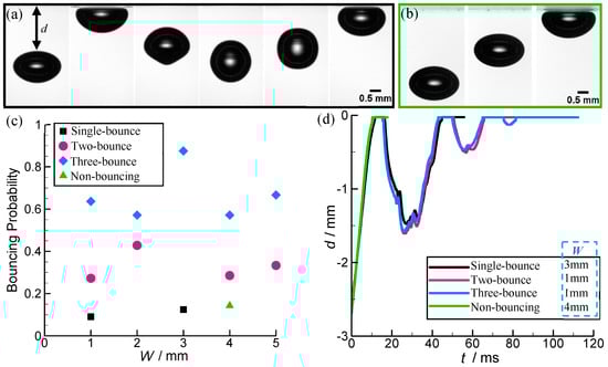 Many previous researches indicated that bubbles tend to bounce when they approach a solid plate [,] and they are not sensitive to the normal wettability of the surface (aerophilic/hydrophobic or aerophobic/hydrophilic) []. The bouncing almost occurs with the bouncing probability of about 100%; however, the surface superaerophilicity can decrease this bouncing probability and results in non-bouncing before spreading []. As can be observed, the bouncing mostly happened when the bubble collided with SALTs (superaerophilicity) of different widths, and in our findings, non-bouncing only takes place for W = 4 mm. This behavior agrees with the previous results [] but with a significantly higher bouncing probability, as shown in Figure 3c. Due to the wall-effect, despite the surface wettability, the liquid film between the wall and the bubble was drained and the shape of the bubble oscillates [], and it tends to bounce downward against the direction of the buoyancy force. During this process, part of the total energy is dissipated due to viscous loss [], and then, the spherical bubble at the largest depth can return to the approach to the wall for its second collision if the total remaining energy is enough. After repeated bouncing motions several times, the energy has completely dissipated, and the bubble transits to be flattened and stops on the wall. When it comes to the SALSs [] or SALTs (present work), the bubble will perform spreading after exceeding this dynamical threshold. The whole bouncing processes for SALTs are described using d(t) plotted as a function of time t, and some typical cases are shown in Figure 3d. A high consistency was found for the evolution of d(t) between these bubble-wall collisions at different W and bounce times. This property indicates that neither SALTs’ width nor bounce times have a significant influence on the d(t) evolution before bubble spreading. Compared with the similar superaerophilic solids [], a similar d(t) evolution can be seen for the bubble colliding with the SALTs; that is, the rebound amplitude sharply decreased as the bounce time increased.