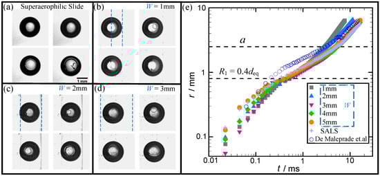 The linear r-t relations of both SALSs and SALTs in the first regime change at about t ≈ 0.3 ms with r ≈ R1 (= 0.4deq), and two different typical r(t)-t relations with different numbers of subregimes emerge for W = 1–2 mm and other wider SALTs and SALSs, respectively. Like the previous work [], the spreading of bubbles is divided into three subregimes: for SALTs of W = 3–5 mm and SALS, denoted as regime (IIb), regime (III) and regime (IV). Note that the transition regime (III) has not been discussed yet, though it can be easily identified in Figure 3d at t ≈ 5.5 ms in this reference. Where (b) indicates the subregime corresponding to the SALTs of W = 3–5 mm and SALS, and thus, regime (IIa) denotes the second subregime for the narrower SALTs (W = 1 and 2 mm). Due to r ≤ a (~2.5 mm) in regime (IIb), the contact size is smaller than the SALT width (≥3 mm), and then the SALT can be equivalent to the SALS. Considering these results and bubble volume conservation of Ω ~ hr2, the balance of dynamical pressure ρV2 (at high Reynold number ~1000) with Laplace pressure γh/r2, as proposed by reference [], yields
