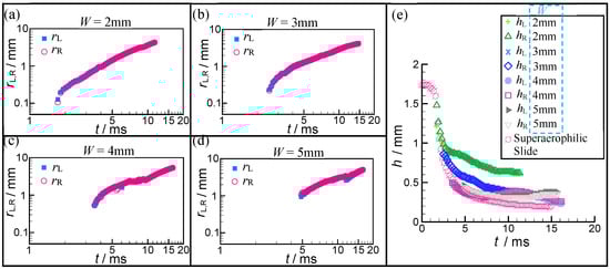 Contact size (rL and rR) and thickness of the two ruptured bubbles plotted as a function of time t. (a)–(d) The rL, R-t curves at W = 2 mm, 3 mm, 4 mm, and 5 mm, respectively. (e) The thickness of the two ruptured bubbles plotted as a function of t at different SALT widths.