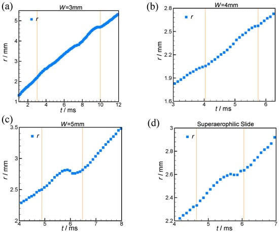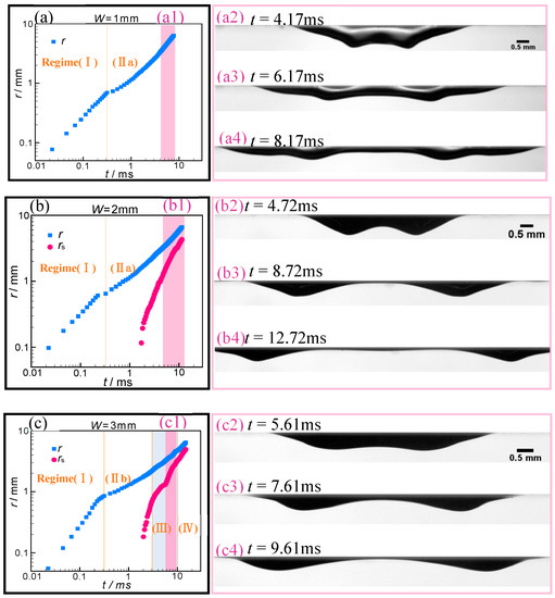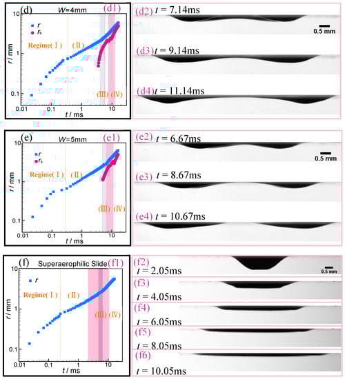 In the reference [], the upper boundary of the regime (IIb) is fixed at the capillary length ~2.5 mm; whereas, in our study, the surface geometry determines it, which decreases with the decreasing W, as shown in Figure 5. For the SALTs of W = 4 mm and 5 mm, and SALS, the spreading bubble would experience a short transition (~1ms and named regime (III)), which also can be seen in Figure 4d from the reference [], but is hardly mentioned, while the interval of regime (III) for W = 3 mm would be significantly expanded. The detailed views of these transitional regimes are presented in Figure 6. This property seems related to the bubble rupture and will be discussed in Section 3.3.