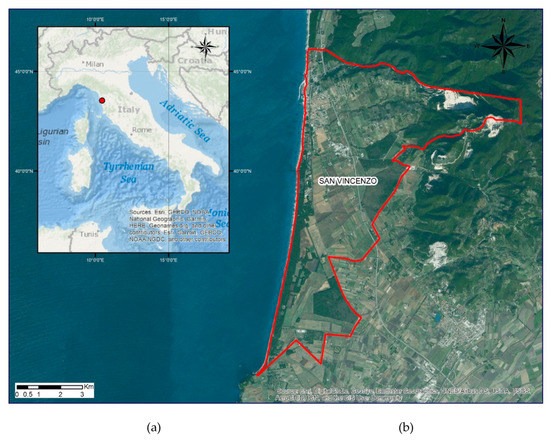 (a) Location of San Vicenzo in the Mediterranean area (red circle marks the study site); (b) Map of San Vincenzo municipality (in red) on the northwestern coast of Italy.