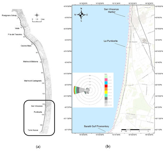 (a) Geographical framing, and sectorization of the Punta–Lillatro sediment cell [31]; (b) San Vincenzo’s littoral zone; in the small plot a rose diagram shows the wave’s field in front of San Vincenzo shore at a depth of 20 m [35,36].