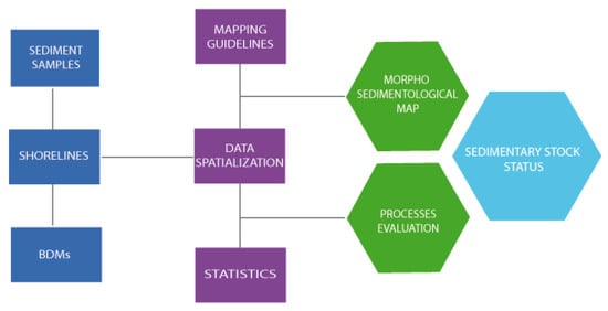 The shorelines and bathymetries acquired were used to spatialize sedimentological properties of the active beach sedimentary coverage. Sediment samples cropped within the harbor area were analyzed and used both to infer information regarding the acting processes as well as to perform the morpho-sedimentological GIS mapping of the coast. The mapping phases took advantage of different regional and national guidelines for geomorphological mapping, as well as of the statistical trends that were extracted from the shorelines and bathymetric fluctuations. A summary of the workflow followed is given in Figure 6.