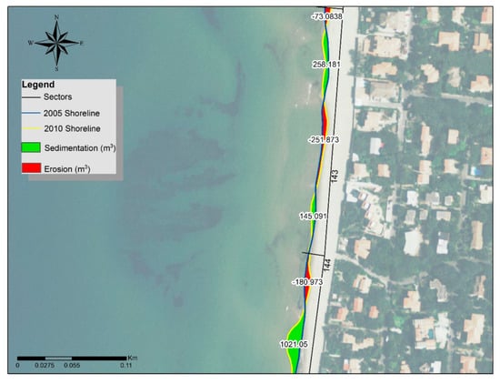 More recent comparisons, for the period of 1996–2006, revealed an average increase of 3.2 m/year in the North harbor area (Figure 4a), and a retreat of 2.2 m/year in the South harbor area, where the sea reached the tourist buildings during storms (Figure 4b) [40,41].