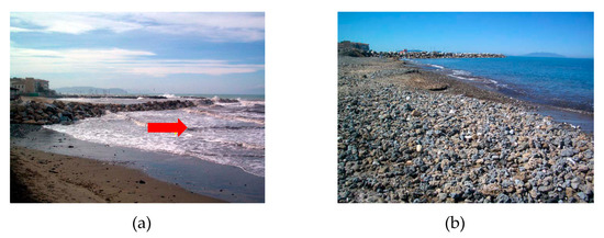 North harbor area (sector 134). (a) The red arrow shows the reflected wave by the breakwater during the working phase in 2006; (b) beach rock fragments that have been dredged during the reshaping of the harbor and used to nourish the erosive spot at sector 134 [40].