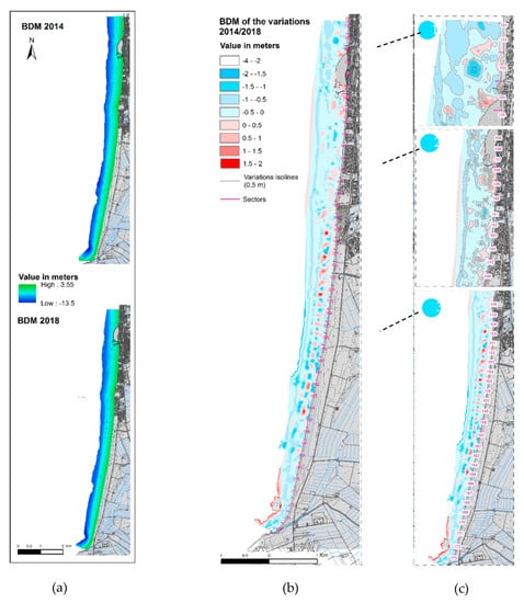 The analysis of bathymetric data through BDMs (Figure 11) is a tried and tested method used to compare different raster datasets. In our case, the approach has proved useful to obtain volume quantities of the sedimentary stock. The error due to the accuracy of measurements, and to the computing phases of model gridding and georeferencing is considered acceptable, given that the instrumentation used assures a 0.02 m resolution, and the bias in the vertical measure corresponds to 5% of the depth [25,47,48,49]. Moreover, in our case, it highlights the relations with shoreline displacement trends and geomorphic shapes.