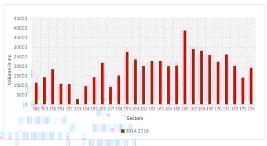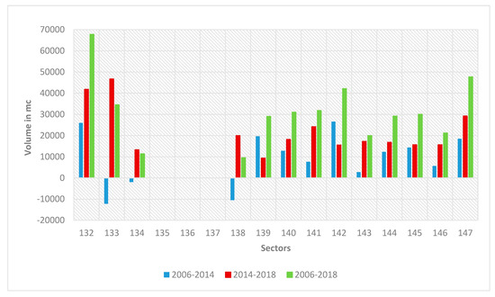 The aforementioned volumetric quantities are shown as histograms in the following figures (Figure 12 and Figure 13). The first period of analysis (blue features in Figure 12) reveals a decrease in the volumes of the submerged beach in the harbor neighborhoods (133 to 138), while in the three sectors from 132 to 135, they increased to 25,000 cubic meters in the last four years. This increasing trend is registered in all the rest of the sectors studied (from 139 to 147). The second period analyzed (2014–2018) represents the first stage after the harbor completion; the data show a general increase of 40,000 cubic meters in sectors 132 and 133, always of at least 10,000 cubic meters, except in sectors 139, 153, 154, and 157. More generally, a bathymetric stripe has been identified in the first three meter of depth; it passed from a balance condition to an increasing trend of the quotes during the last four years analyzed. The same trend was registered from the isobath −5 m seaward, except for sectors 172, 173, and 174, where the old fluvial system was connected to a submerged canyon that could intermittingly drive the discharge process. In the intermediate bathymetric stripe (−3 to −5 m), a peculiar alternation between erosion/sedimentation can be observed. The total amount of volumetric variation for the whole period analyzed (2006–2018) can be lastly observed through green features in the histogram (Figure 13). These data clearly prove the wide increasing of sediment in the submerged beach in the harbor area.