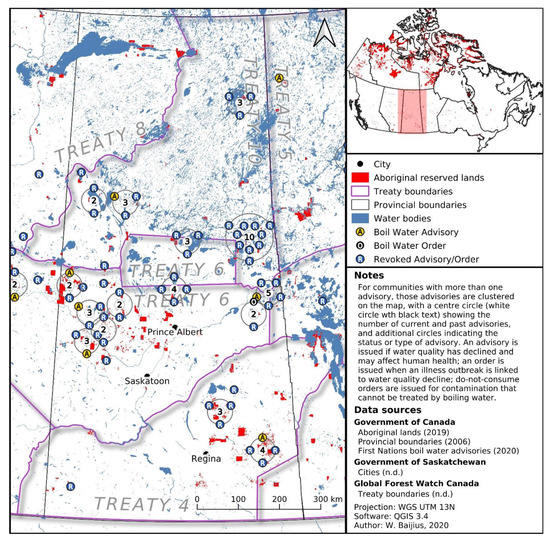 - von der Porten, S.; de Loë, R.C. Water Challenges and Solutions in First Nations Communities; Water Policy Governance Group: Waterloo, ON, Canada, 2010; pp. 1–15. Available online: https://uwaterloo.ca/water-policy-and-governance-group/sites/ca.water-policy-and-governance-group/files/uploads/files/vonderporten_and_deloe_2010_0.pdf (accessed on 23 December 2019).