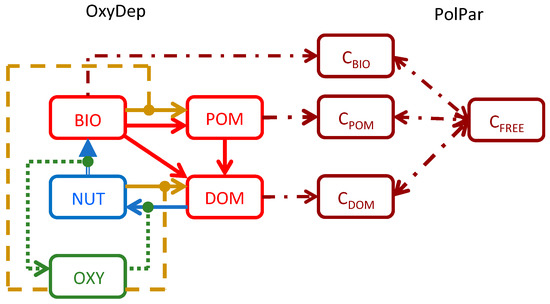 Schematic diagram of biogeochemical processes in the biogeochemical module (Oxygen Depletion Model (OxyDep)) and its coupling to the pollutant-partitioning model (PolPar). It is assumed that the total pollutant can be partitioned between pollutant (CBIO) in biota (BIO), pollutant (CPOM) in particulate organic matter (POM), pollutant (CDOM) in dissolved organic matter (DOM), and remaining free dissolved fraction (CFREE).