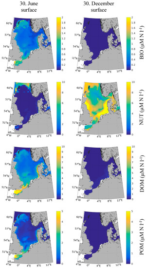 Aiming at understanding the seasonal variability of the nitrogen species in the North Sea, Suratman et al. [53] measured the following typical ranges of the surface concentrations of nitrate (0.1–7.2 µM N), ammonium (0.1–2 µM N), DON (the dominant fraction of total nitrogen in all seasons [53], a fact that could not be confirmed by our model) (1.9–11.2 µM N), and PON (0.3–5.6 µM N) in the western central part of the North Sea. Our estimates for this region (Figure 3) were clearly in the same range of magnitude and furthermore represented the observed seasonality with high NUT concentrations in winter (Figure 3b) and nitrate depletion in the surface waters in summer (Figure 3a). Additionally, DOM concentrations were slightly underestimated by the model. The discrepancies might have stemmed from the fact that the DOM model only represented labile autochthonous organic nitrogen (and ammonia), while the observed one also included more stable allochthonous organic matter supplied by rivers and the currents. Chlorophyll-a (Chl-a) in the North Sea was found to vary between 0.1 and 6.2 µg L−1 [53], which was approximately 0.03–1.6 µM N. The model simulated BIO showed a comparable range (Figure 3).