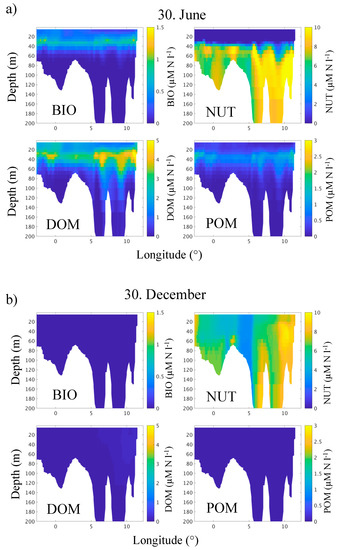 Vertical distribution along transect 1 (58° N see Figure 1) of the variables BIO, DOM, NUT, POM in June (a) and December (b), as estimated in the biogeochemical module OxyDep.