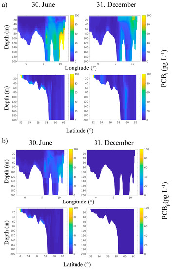 The model demonstrates a seasonal signal in the vertical distribution of PCBs in the water column (Figure 7). The synthesis of OM during spring and summer production resulted in the consumption of the dissolved pollutant into its particulate form due to partitioning processes (Figure 8). In contrast to the model described by [24,26], a separation between particulate and dissolved fractions of pollutant led to a simulated maximum of the total pollutants at an intermediate depth between 50 to 100 m. This intermediate maximum was especially pronounced during the stratified summer period, while thermal convection due to autumn and winter cooling resulted in a homogenization of the water column in winter and the destruction of the subsurface maximum of PCBs in the process. However, the vertical maximum of PCBs in the dissolved phase was maintained in the stratified Norwegian Coastal zone and the Skagerrak. The sinking of pollutant-enriched organic particles resulted in a decrease of the total pollutant concentrations in the euphotic zone (from the surface down to 30–40 m) and an increase of concentrations in the intermediate waters below. The latter coincided with the bottom layer in the shallower areas. Here, the pollutants were returned to their dissolved form in the process of decay of particulate and dissolved organic matter, resulting in a vertical pollutant maximum. During winter, biological production was almost absent, and the water column was mixed by thermal convection homogenizing the pollutant concentration (Figure 7). A significant fraction of the pollutants, exported during the productive season, was then returned to the surface. This was illustrated by elevated surface PCB concentrations in December compared to June (Figure 8). Thus, the model results verified the “biological pump” as a key mechanism for the formation vertical stratification in pollutant concentrations and thereby confirmed earlier theoretical hypotheses by [11,12,14].