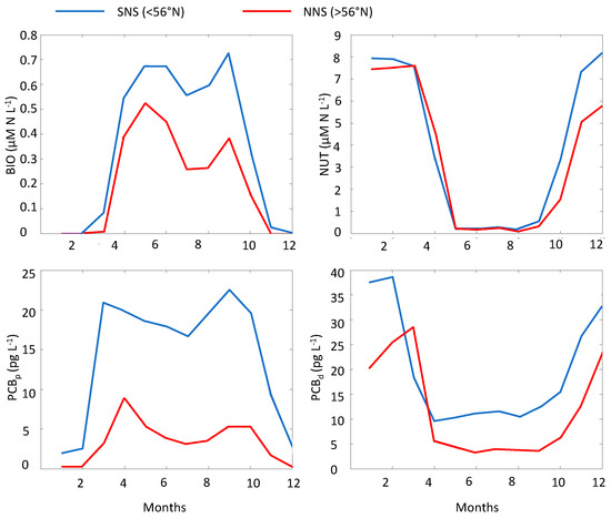 Estimated mean seasonal cycle of surface BIO, NUT, dissolved PCB (PCBd), and particulate PCB (PCBp). Average monthly mean values are given for the northern North Sea (NNS > 56° N) and for the southern North Sea (SNS < 56° N).