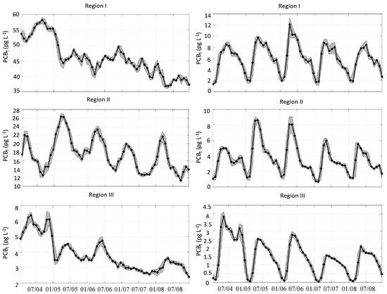 Temporal variability of the volume-averaged concentrations of total PCBt (left) and particulate PCBp (right) in the regions I (top), II (middle), and III (bottom) in 2004–2008 (for region separation, see Figure 1). (Note that the y-axis scales vary in magnitude).