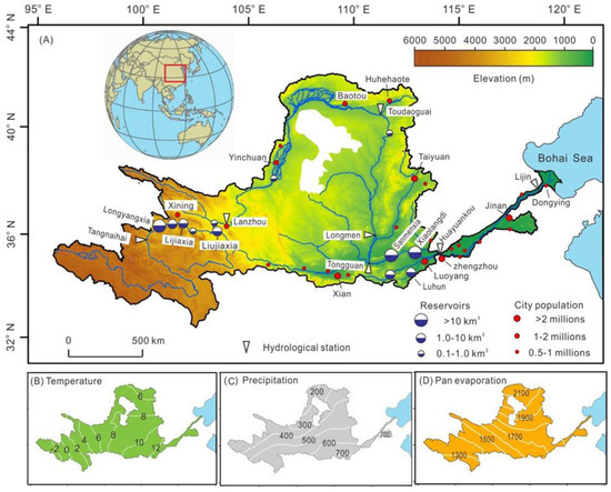 The Yellow River basin. (A) Elevation, river system, and major hydrological stations, reservoirs and cities (Xining, Lanzhou, Yinchuan, Huhehaote, Taiyuan, Xian, Zhengzhou and Jinan are provincial capitals). (B–D) Contours of time-averaged (1957–2016) temperature, precipitation and pan evaporation, respectively (based on data gauged at 83 stations).