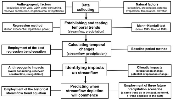 There are several types of approaches for separating the impacts of climate change and human activities on streamflow, including (1) hydrological modeling, (2) conceptual approaches (Budyko hypothesis, Tomer Schilling framework), (3) analytical approaches (climate elasticity method and hydrological sensitivity method) and (4) methods based on hydrological field data (paired catchment method, time-trend method) [28]. Although these approaches are different in principle, material and procedure, they are all useful [28]. In this study, taking the advantage of systematic data (e.g., precipitation, potential evaporation, streamflow, population, grain yield and GDP), we used the time-trend method for evaluating quantificationally the past trends of the variables and the contributions of major driving factors to the decline trend of streamflow, and for predicting the commence of streamflow depletion in the future decades under scenarios of climate change and human impacts. This method is frequently employed in analysis of hydrological processes [15,16,17,28,29,30]. Without using this approach, it would be difficult for us to achieve our objectives.