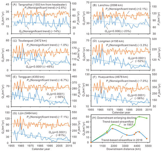 Temporal trends in annual precipitation water and streamflow at the gauging stations on the YR mainstem. (A–G) Time series of annual precipitation water received in the catchment upstream of the gauging station (Pw) and streamflow measured at the station (QM) (solid line), trendline (dashed), significance level (p) and trend-based relative change (%, positive and negative values indicating increase and decrease, respectively). The subfigure title indicates the name of the gauging station and the distance between the station and headwater. Each trendline represents the statistical equation which is highest in correlation coefficient among linear, logarithmic, power and exponential regressions. Statistical equations are shown in Table A2. (H) Downstream intensified streamflow decline. The first point represents the headwaters, and the other seven points represent the gauging stations Tangnaihai, Lanzhou, Toudaoguai, Longmen, Tongguan, Huayuankou and Lijin from upstream to downstream.