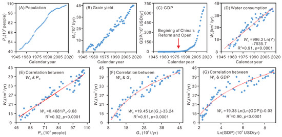 Rapid increases in population (Po), grain yield (GY), gross domestic product (GDP) and water consumption (WC), and the close correlations with between WC and Po, GY and GDP within the Yellow River basin. Y: Calendar year. R: Correlation coefficient. p: Significance level.