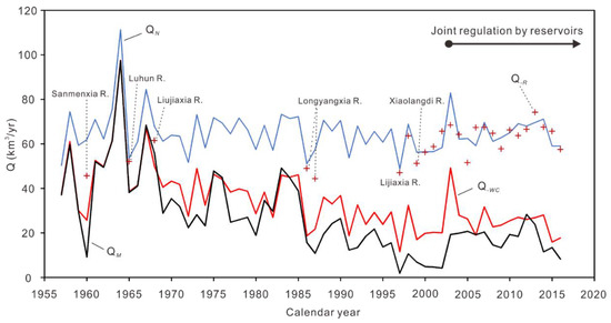 Human impacts on annual streamflow (Q) to the sea in the Yellow River. QN: Natural Q derived from precipitation (without human impact). Q−R: QN deducted by the impact of a reservoir or reservoirs. Q-WC: QN deducted by water consumption. QM: Streamflow measured at Lijin Station (with human impacts). The difference between QN and QM reflects the total impact of human activities. Sanmenxia R., Luhun R., Liujiaxia R., Longyangxia R., Lijiaxia R. and Xiaolangdi R. indicate that the major reservoirs each reduced the streamflow by >1 km3 at the initial water impoundment. Detailed information on these reservoirs is shown in Figure 1A and Table A4.