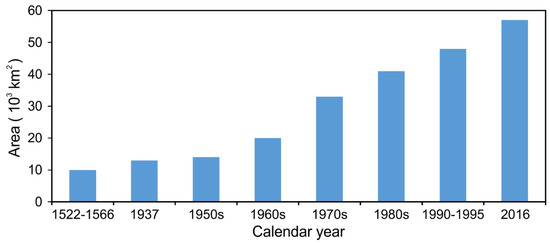 Historical increase in irrigation area within the Yellow River Basin (the data in 1522–1566 and 1937 are after Lu [38]; the data in the 1950s, 1960s, 1970s, 1980s and 1990–1995 are after Miao et al. [21])