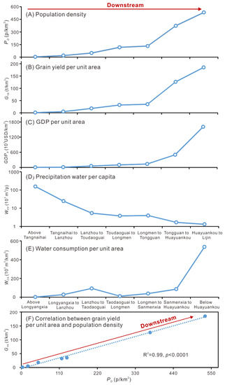 Although previous studies have found that the decline in streamflow in the YR was aggravated downstream of the upper reaches [21,52], less is known about the underlying causes. Here, we show that, from the headwaters to the lower reaches, the 60-year average population density, grain yield per unit area and gross domestic product (GDP) per unit area increased by more than two orders of magnitude (Figure 7A–C; Table A5). The rapid downstream increases in population density and grain yield per unit area are closely correlated (Figure 7F), which reflects that the areas with high population density are also the areas with high grain yield. Subsequently, the water consumption per unit area increased by more than two orders of magnitude from the headwaters to the lower reaches (Figure 7E; Table A5). The per capita precipitation water resources decreased by two orders of magnitude (Figure 7D; Table A5). These results suggest that the conflict between water availability and water demand was more serious in the lower reaches than in the upper reaches. As a result, the human impact on streamflow increased downstream. Additionally, the growths of population density, grain yield per unit area and GDP per unit area over the past 60 years have increased downstream. From the period 1957–1966 to the period 2007–2016, the population density growth increased from 2 p/km2 in the headwater areas to 270 p/km2 in the lower reaches, the growth of grain yield per unit area increased from 0.6 t/km2 in the headwater areas to 240 t/km2 in the lower reaches, and the growth of GDP per unit area increased from 22,000 USD/km2 in the headwater areas to 3,600,000 USD/km2 in the lower reaches (Table A5).