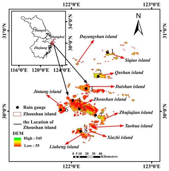 Daily rainfall records of eight gauges from 1979 to 2015 were collected, and their locations and basic information are shown in Table 1. Among them, Shengsi and Dinghai are weather stations measuring rainfall and other metrological variables (with type denoted by “WS”), and the data of Qushan and other five stations just observe rainfall (with type denoted by “RG”). Rainfall data observed by all gauges were subject to strict quality control, and suspicious and erroneous data were manually checked and corrected. Table 1 shows that the rainfall data from Shengsi and Dinghai are continuous, but are missing within certain period for other gauges.