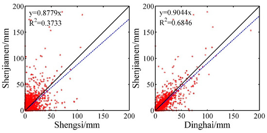 Daily rainfall scatter and linear regression relationship between Shenjiamen and the two weather gauges Shengxi and Dinghai.